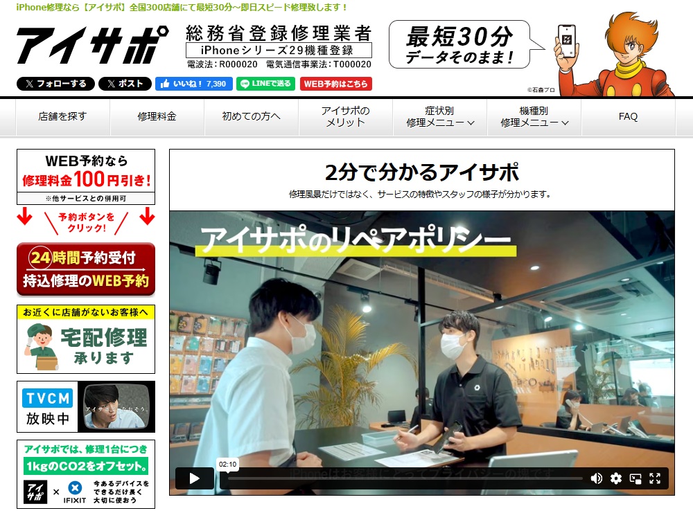 アイサポは、全国に店舗を展開するiPhone修理サービスで、画面割れやバッテリー交換、水没修理など幅広いトラブルに対応しています。即日修理を基本とし、予約なしでも利用しやすい点が特徴です。修理工程や料金体系が明確で、初めて修理を依頼する人でも安心して相談できます。データを消さずに修理できるケースが多く、日常利用への影響を最小限に抑えられる点も支持されています。